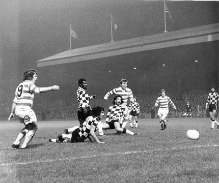 However that moment of glory led an uncomfortable end to the game for the big Englishman. For the duration of the match the pitch had been ringed by armed soldiers, indicative of the level of unrest prevalent in Portugal at the time. Following on from his penalty save an instruction came from the bench that Latchford should take a more leisurely approach to taking goal kicks in order to run the clock down. When he attempted to carry this advice out he was ‘encouraged’ to hurry by a soldier poking him in the back with the business end of his rifle (presumably this particular private had forgotten his carnation). From that point onwards lightning fast goal kicks were a feature of the game much to the bemusement of the Celtic bench.