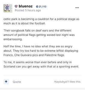 He certainly isn’t impressed by what’s going on at Celtic Park, a veritable “cauldron for a political stage” (whatever that means). “half the time,” he confesses, “I have no idea what they are so angry about. (the other half of the time I suspect he doesn’t know about anything much) They try so hard to be extreme leftist displaying Franco, Che Guevara and Palestine flags.”
