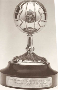 Celtic and di Stefano would cross paths again three years later, this time on the football pitch. Among the trophies adorning Celtic Park is the Real Madrid Golden Ball, featured in John Traynor and Douglas Russell’s illustrated book (1991) alongside the following caption: “On 7th June 1967, fresh from the pinnacle of achievement in the European Cup Final, the Lisbon Lions entered the cauldron of the Santiago Bernabeu Stadium in Madrid to have their new stature tested in the fiercest of fires. Real threw everything at Celtic in an attempt to re-assert themselves in a ‘friendly’ against their immediate successors as European Champions but the flowering Parkhead maturity prevailed for a 1-0 victory, courtesy of an inspired performance by goalkeeper John Fallon, the solitary strike of Bobby Lennox and a scintillating display by Jimmy Johnstone, who received a standing ovation.