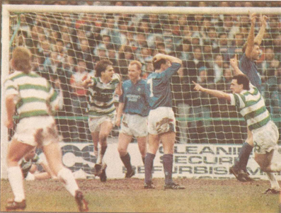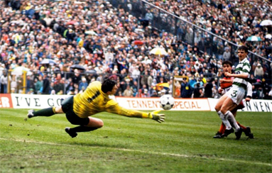 With nothing of note having happened for 40 minutes John Brown misjudged a Woods bye kick and Galloway went forward with the ball. He played to Dziekanowski who carried it on before playing in Joe Miller. He hit a cross-cum-shot which Tommy Coyne bundled into the net. Looked at through neutral eyes it was a scrappy goal, but it was absolute manna from heaven for Celtic.
