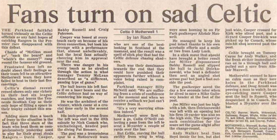 Above: The Herald reports the demonstration outside the main stand after the defeat against Motherwell: ‘“Chants of McGinn must go,” “Sack the board” and “Where’s the money?” rang round the famous old ground.’ As early as January 1990 the writing was on the wall.