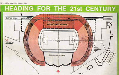 Chairman Jack McGinn revealed in the Celtic View in August 1990 that the directors all favoured remaining in our present location and that the possible redevelopment of the stadium as depicted in the club’s official newspaper was the result of eighteen months work. Not 18 minutes as you might have guessed from the fag-packet sketch above.