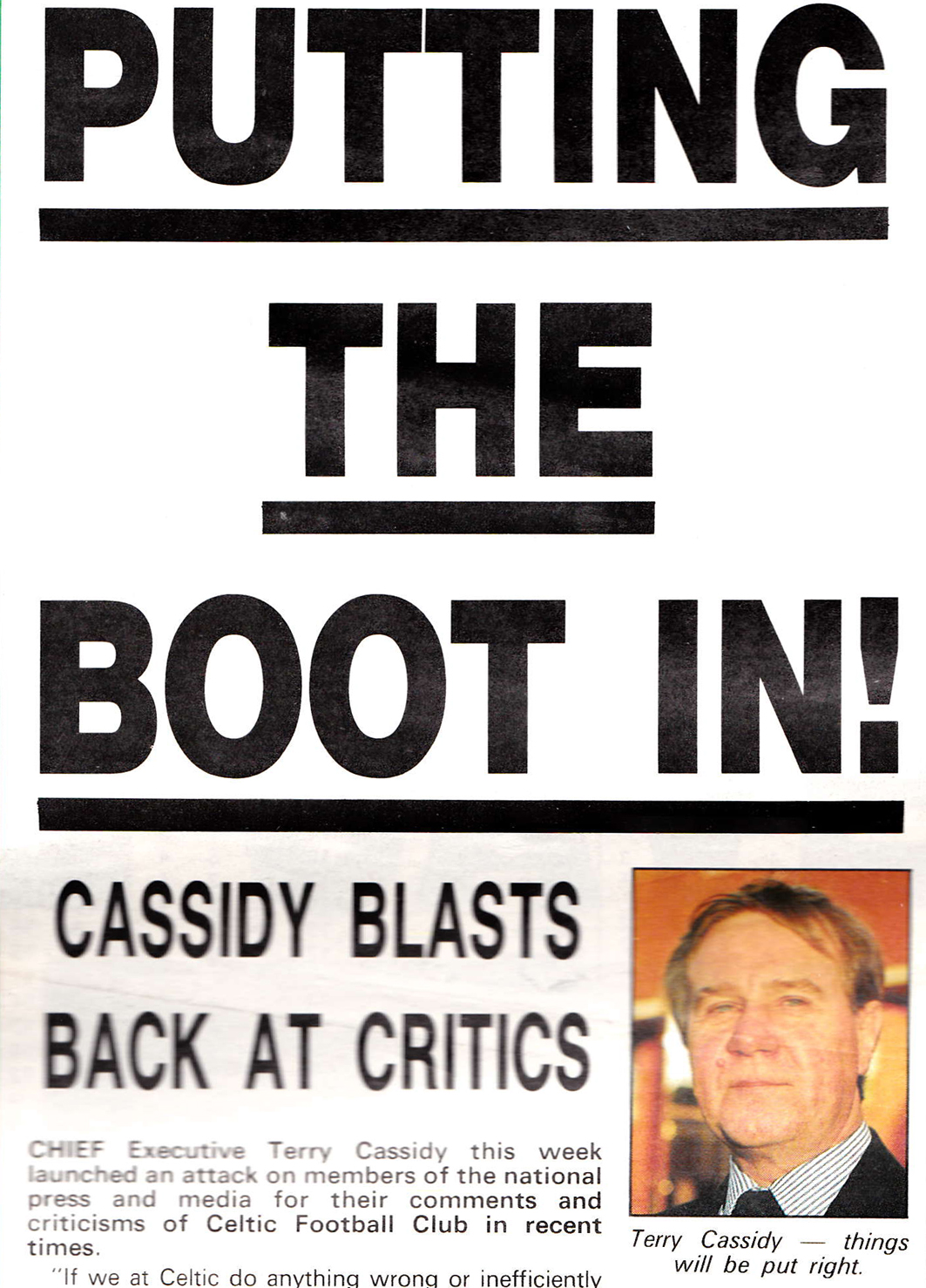 A Celtic View front page from January 1991. Terry had only just got his feet under his desk but blasting was more or less his default posit